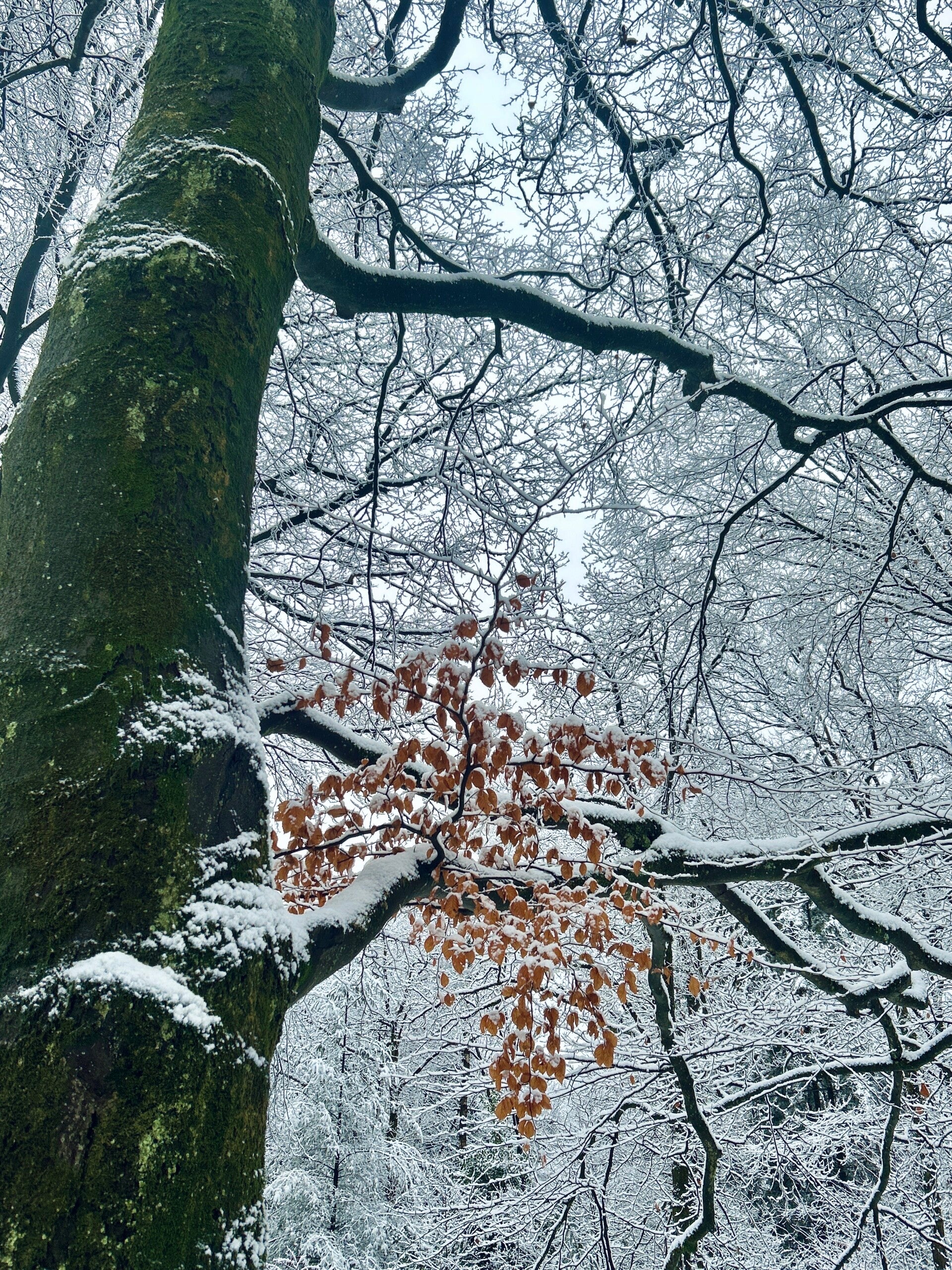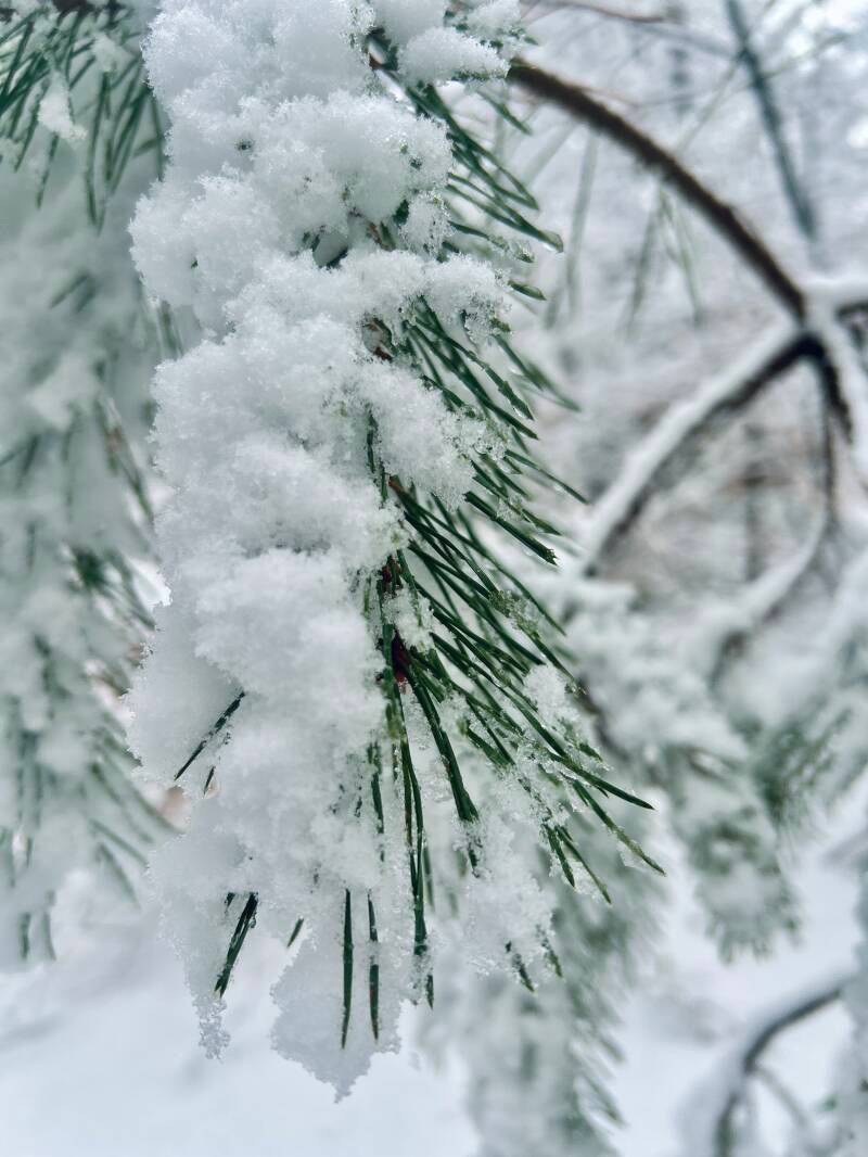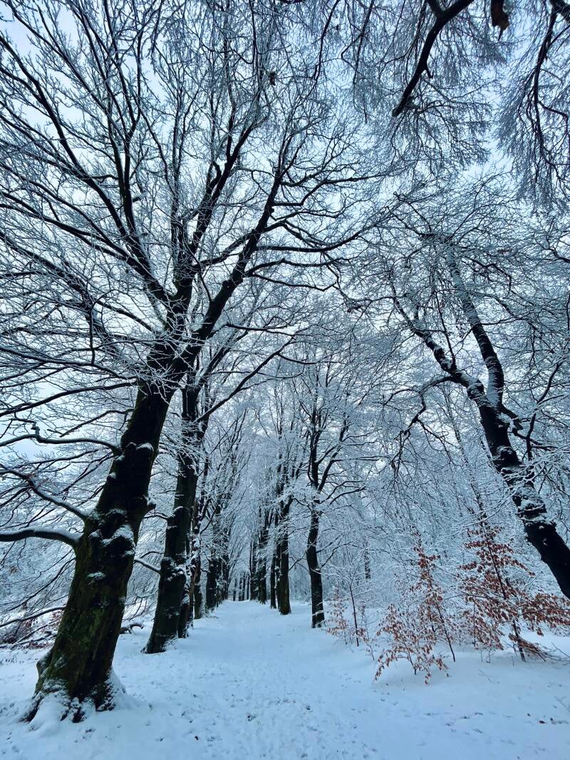 De bomen zijn bedekt met zachte laagjes poedersneeuw. Wat is het sprookjesachtig mooi! De sneeuw knispert onder mijn wandelschoenen en ik geniet van de eerste stappen in het nieuwe jaar 2026.